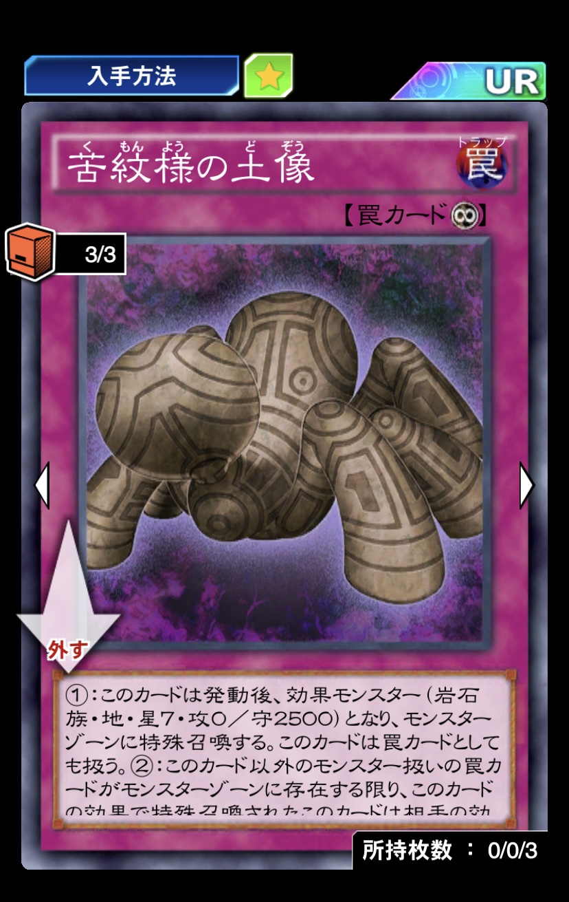 【苦紋様の土像】【効果】①:このカードは発動後、効果モンスター(岩石族・地・星7・攻0/守2500)となり、モンスターゾーンに特殊召喚する。このカードは罠カードとしても扱う。②:このカード以外のモンスター扱いの罠カードがモンスターゾーンに存在する限り、このカードの効果で特殊召喚されたこのカードは相手の効果の対象にならない。③:このカードの効果で特殊召喚されたこのカードが存在し、自分の魔法&罠ゾーンのカードがモンスターゾーンに特殊召喚された場合、フィールドのカード1枚を対象として発動できる。そのカードを破壊する。